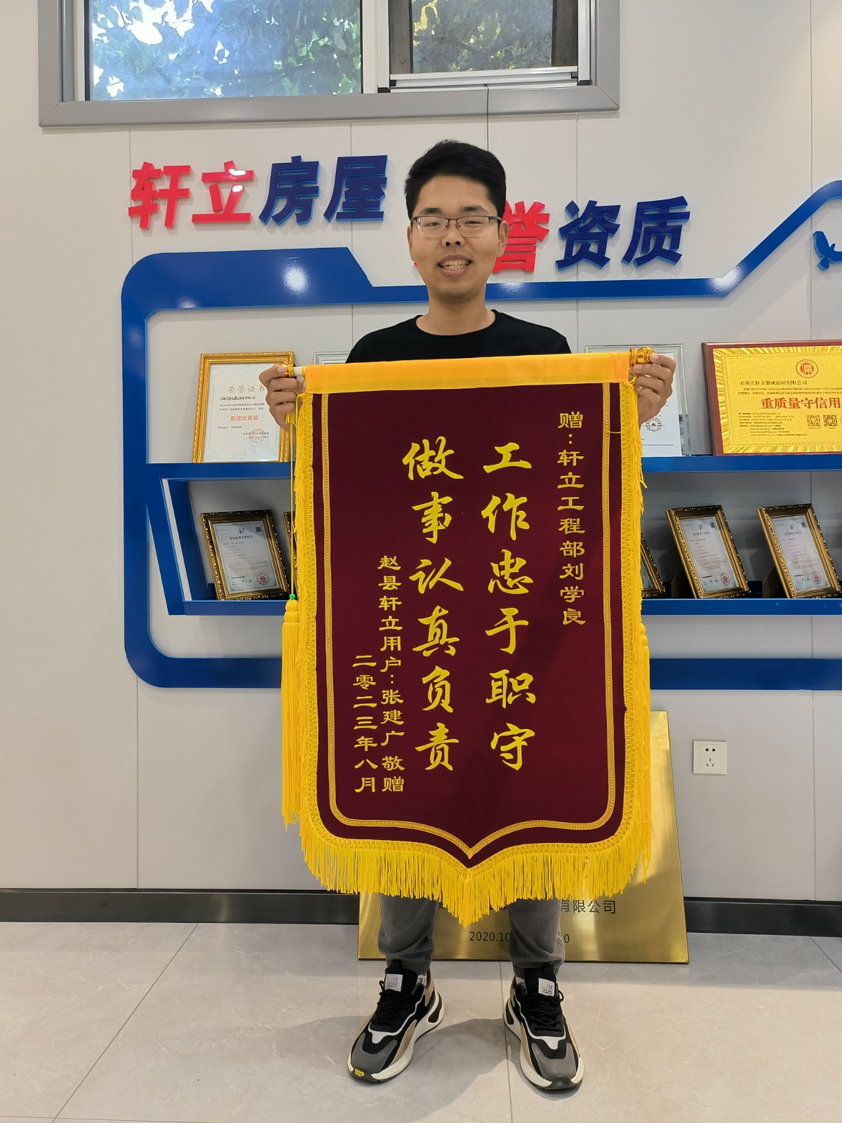 8月28日,對于軒立來說又是一個特殊的日子。今天,軒立收到了來自石家莊趙縣前大章鄉(xiāng)后大章村業(yè)主張建廣先生贈送的三面錦旗,給予“一心為民建好房,恪守信用高質(zhì)量”“工作忠于職守,做事認真負責(zé)”“切實履行責(zé)任,不負客戶重托”的高度評價,是對業(yè)務(wù)經(jīng)理師碩、項目經(jīng)理劉學(xué)良工作認真負責(zé)的高度贊揚,也是業(yè)主張先生對石家莊軒立集成房屋有限公司的匠心品質(zhì)的信任與肯定,以及對我們所有員工的一份認可與鼓勵。